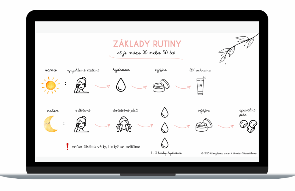 Dodržuji ranní a večerní rituál doporučený na webináři. Paradoxně mám větší problém dodržet ranní zkrácenou péči než večerní rituál. Pleť je úplně jinde, šupinky zmizely, miluju ten pocit na konci péče, obličej je krásně „šťavnatý“.
